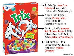 The "acceptable levels" of dyes in food are based on 35- to 70-year-old studies, before the effects on children were known. We now know that just 1mg of dye can cause hyperactivity, while one serving of TRIX may contain over 30mg!