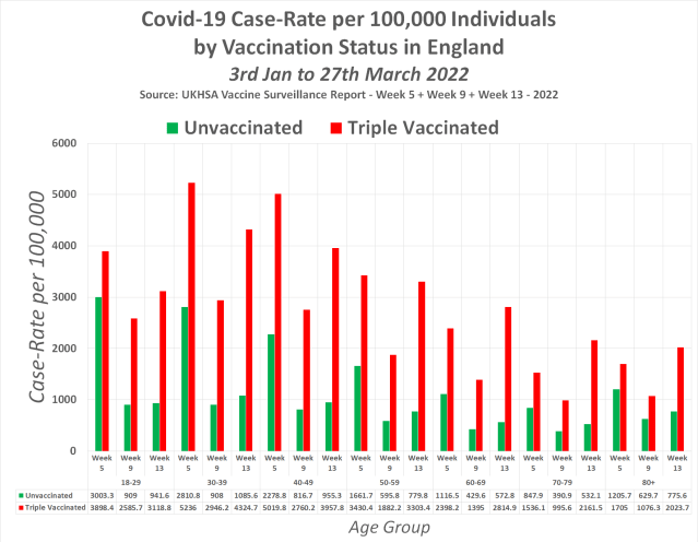 The eye-opening chart, encompassing the period from January 3rd to March 27th, 2022, unveiled the total number of Covid-19 cases categorized by vaccination status and age group in England. The data, extracted from the the UK Health Security Agency (UKHSA) Week 5, (page 43), Week 9 (page 41) and Week 13 (page 41) Covid-19 Vaccine Surveillance reports , painted a vivid picture of the disconcerting reality.