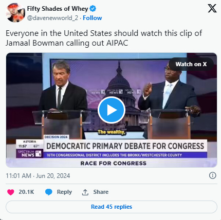 Bowman has been calling out AIPAC’s influence throughout the election, as can be seen in this clip from his debate on Spectrum News with his rival George Latimer.