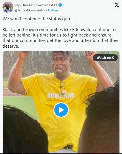 Bowman released footage of him campaigning in the rain for the upcoming primary. As many X users pointed out, there was no reason for him to be standing in the rain as the volunteers he was talking to were standing under a tent.