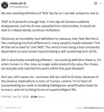 Here’s a definition of AGI by Vitalik Buterin, who highlights the sheer potential of AGI: