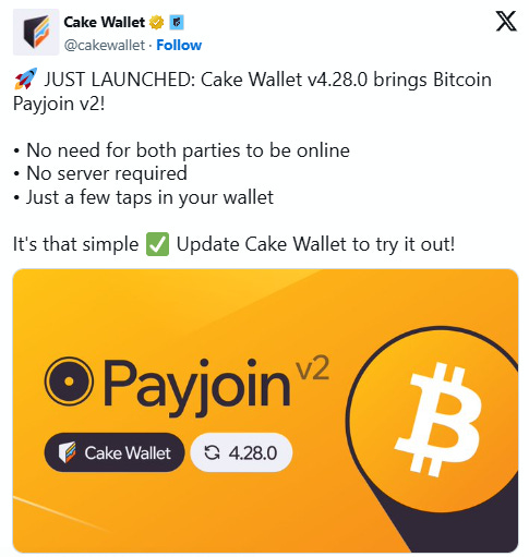 Cake Wallet, a non-custodial open-source wallet for cryptocurrencies, has officially launched PayJoin v2, becoming the first major mobile wallet to offer Bitcoin silent payments to everyday users.