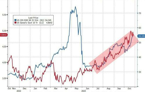 One look at the market's perception of USA's sovereign credit risk tells you all you need to know about Yellen and her inane sponsorship of Bidenomics... wrecking America's financial situation - evidenced by UST yields are rising along with USA sovereign risk's sudden surge...