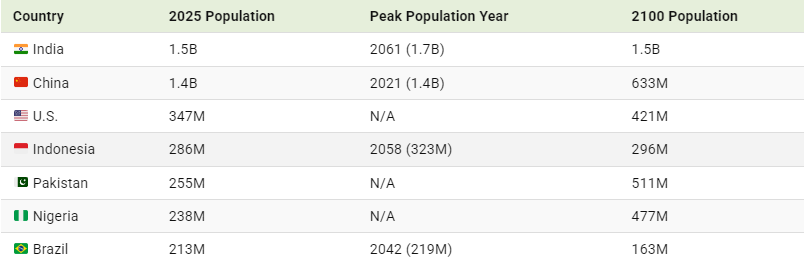 Charted: When the World’s Largest Countries Will Hit Peak Population