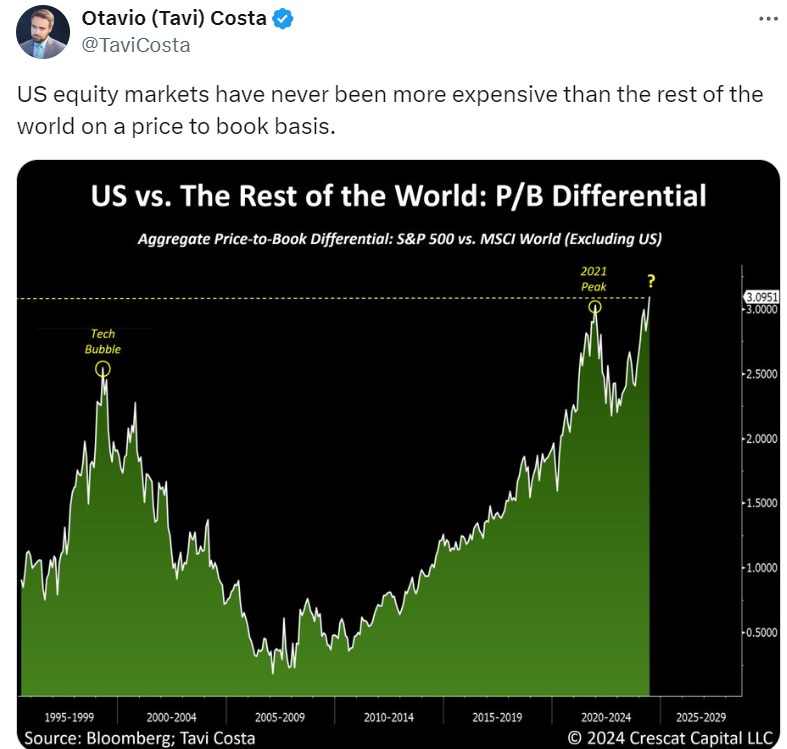 US households' stock allocation as a percentage of financial assets hit a new record of 41.6% in Q1 2024. This is up from 30.5% in 2020 and even higher than in the 2000 Dot-Com bubble peak of 38.4%.