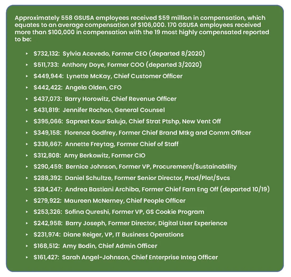 The Girl Scouts might consider producing a product or service of the highest quality. Substantially less sugar, harmful seed oil fats, at least organic wheat or other grains without all the toxic harmful chemicals. Secondly, evaluate the salaries of the mgmt. from $100,000 to over $700,000. This looks like a great wealth transfer from low and middle income families, that would not be in the best objectives for Girl Scouts to learn and copy.