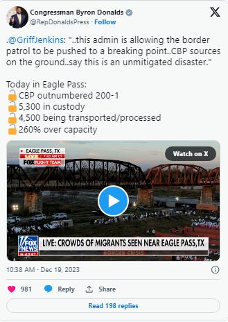 "The true number is *significantly* higher because there are thousands still waiting to be processed in Eagle Pass and they do not count in the numbers until they are put into the computers. The official numbers yesterday include over 11,000 Border Patrol apprehensions of illegal immigrants and more than 1,600 migrants encountered at CBP ports of entry. This breaks the record of 12,000 encounters that was set just two weeks ago."