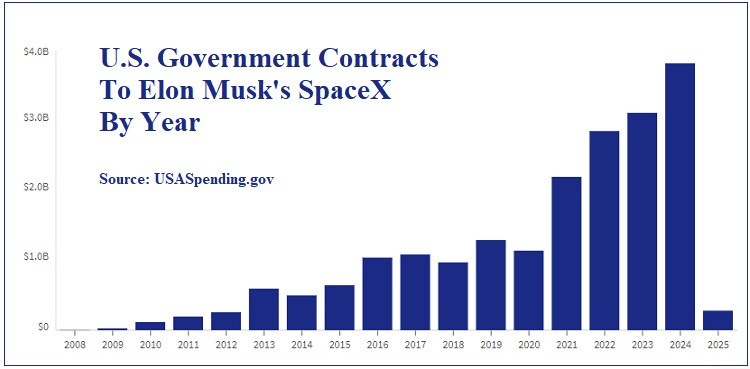 In addition, Musk’s companies have received $19.8 billion in U.S. government contracts since 2009. (See chart above.)