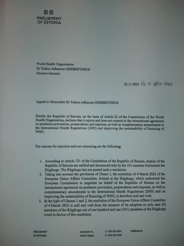 Now the Parliament of Estonia has spoken. Below is a copy of the letter from the parliamentarians to WHO rejecting its Pandemic Treaty and IHR amendments.