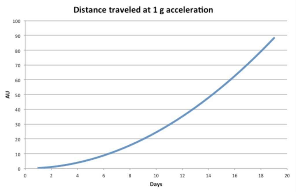 Basically, Buhler is quoting constant 1G travel times.