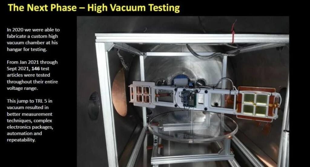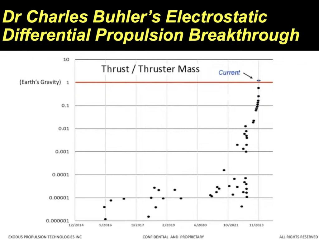 Dr. Charles Buhler and Exodus Technologies claims that systems with electrostatic pressure differences or electrostatic divergent fields gives systems with a center of mass with non-zero force component (aka generate movement). Buhler is NASA’s subject matter expert on electrostatics. They want to move to demo the system in orbit. These kinds of claims are controversial but the work seems to be thorough. It will only cost about $500k to $1M to create a rideshare mission into orbit to test the system. The mass of an early orbital system would greatly exceed the active materials of the propulsion, which would reduce performance. High performance space propulsion would need to increase the active materials as a percentage of the mass of the craft. Nextbigfuture covered that they were getting millinewtons of force but they reduced the weight of the device to the point where the ground based test could cancel out the mass. In effect producing an counter to gravity effect.
