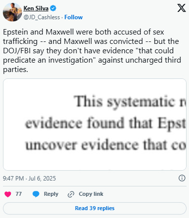“This systematic review revealed no incriminating ‘client list.’ There was also no credible evidence found that Epstein blackmailed prominent individuals as part of his actions. We did not uncover evidence that could predicate an investigation against uncharged third parties,” the unsigned memo said.