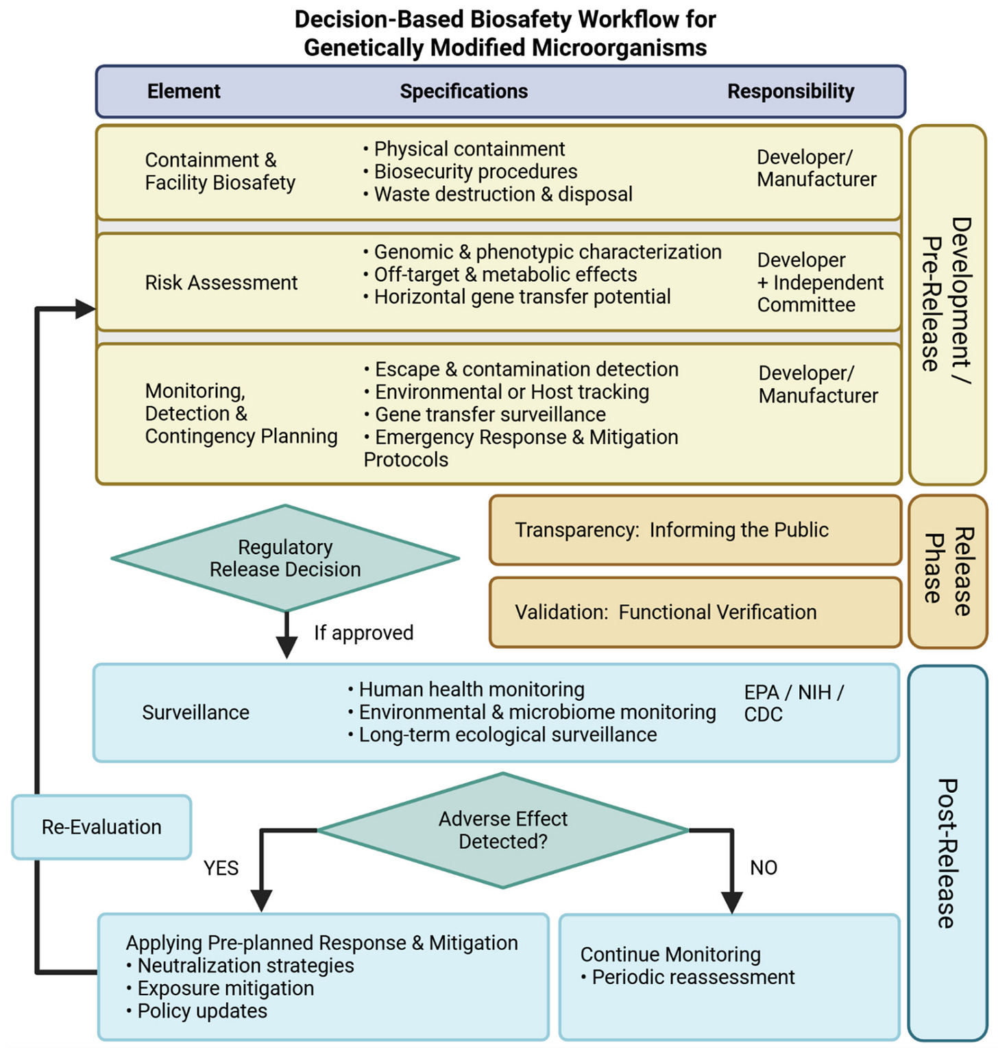 While there are numerous technical obstacles, these concerns can still be confronted as comprehensively as possible when developing a new GMM. To answer this need, we have included a comprehensive key risk categories checklist (Table 1) and a decision-based biosafety workflow (Figure 1). These tools are designed to illustrate the laws, regulations, and practices necessary to protect human health and the environment from the potential negative outcomes of GMMs. We also provide examples of alternative GMM risk mitigation technologies