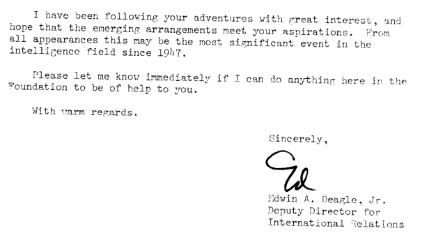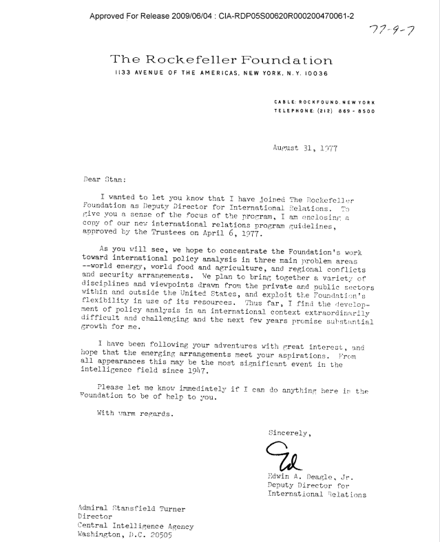 Declassified documents, released via Freedom of Information Act requests, reveal Deagle’s communication with the then United States Director of Central Intelligence, Stansfield Turner, hinting at a relationship with the CIA.