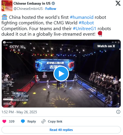 The World Robot Competition Mecha Fighting Series had four human-controlled robots built by China-based firm Unitree compete in three, two-minute rounds with winners crowned through a points system, according to a May 26 report from the China state-owned outlet the Global Times.