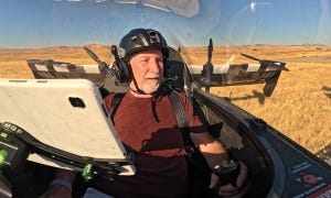 The aircraft’s oval shape, rectangular wings and eight propellers resemble a shuttle in an early Star Trek! episode. Its 14-foot length and the similar lengths of the wings seemed at odds with how light it was on the trailer as we prepped. I strapped on my helmet, screwed in the canopy, and went through the pre-flight checklist.
