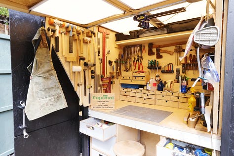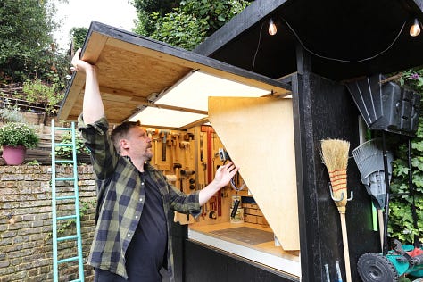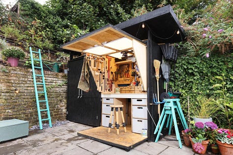 "We needed a good bit of storage for the garden necessities," explains Robinson. "Off-the-shelf options would have taken up too much room so went with a DIY design and build. I think 'The Tiny Workshop' has worked a treat. It's a creative space where I can tinker and mend, as well as have the storage space for garden stuff, kids' games and tools.