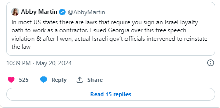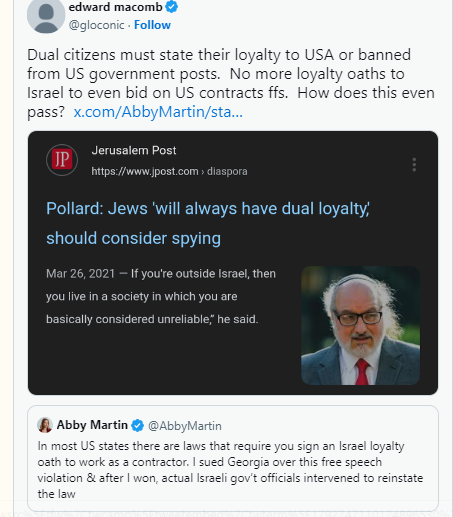 One critic demanded that “dual citizens must state their loyalty to USA or banned from US government posts. No more loyalty oaths to Israel to even bid on US contracts. How does this even pass?” As of 2020, 32 state legislatures had passed ‘anti-BDS laws requiring contractors to sign pledges promising not to boycott any goods from Israel, or their contracts would be terminated, which is unconstitutional.
