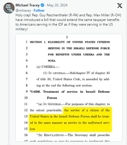 A bill introduced by a pair of House Republicans, Guy Reschenthaler and Rep. Max Miller, would give taxpayer benefits to Americans who serve in the Israel Defense Forces (IDF) as if they were serving in the US military. Israel is a foreign country, however, and this law would codify dual loyalty to Israel into US law at taxpayer expense. Reschenthaler said that over 20,000 American citizens currently in the Israeli military.