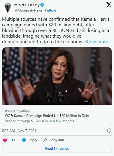 $20 million just happens to be the exact amount of debt Harris’ campaign ended up with.