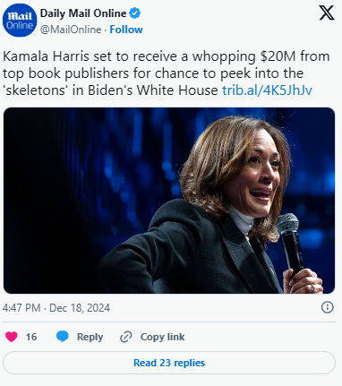 The Daily Mail notes that the source told them “Virtually the moment Kamala lost to Trump, the offers began pouring in from the publishing world for her to do the definitive book on what really went on between Joe and Kamala,”