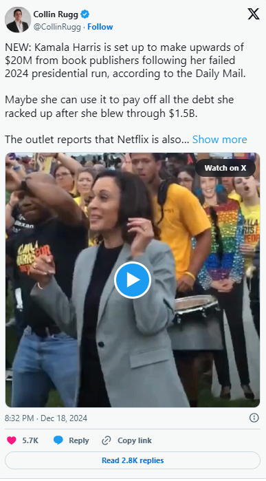 All time worst presidential loser Kamala Harris is set to make $20 million from a book deal, and may sign an exclusive contract with Netflix, according to a report citing a Harris insider.