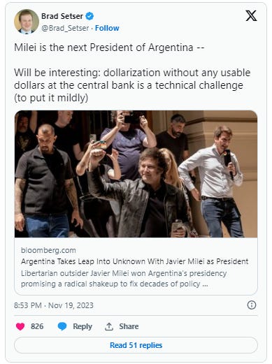 Milei is the next President of Argentina -- Will be interesting: dollarization without any usable dollars at the central bank is a technical challenge (to put it mildly