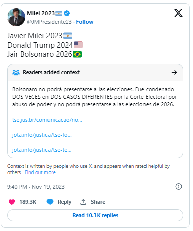 In 2023, Milei ran for president, proposing to allow people to freely buy firearms and human organs, promising to repeal the Voluntary Termination of Pregnancy Act, and advocating for the criminal punishment of abortion. In the August 2023 presidential primaries, Milei received 30% of the votes, becoming the first far-right candidate to win a primary since Argentina’s elections began in 1916. In the second round of voting held on November 19, Milei defeated his opponents and was elected the new president of Argentina.