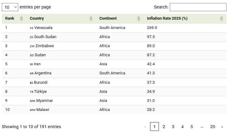 Below, we show the inflation rates of 191 countries and territories worldwide in 2025: