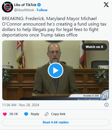 BREAKING: Frederick, Maryland Mayor Michael O’Connor announced he’s creating a fund using tax dollars to help illegals pay for legal fees to fight deportations once Trump takes office pic.twitter.com/XN5hFZ0NMZ