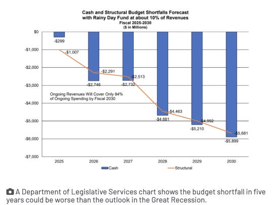 Maryland faces more than $1 billion in combined structural and cash deficits in the current year. That gap more than doubles to $2.7 billion in fiscal 2026 and 2027.
