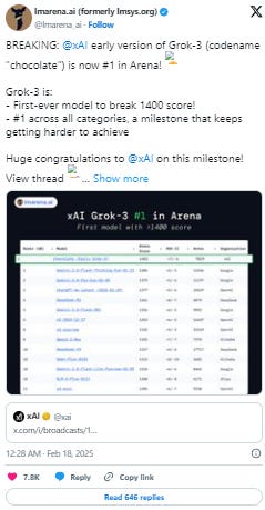 The LLM blind test by LMArena found Grok3 achieved a record milestone of 1400 score.