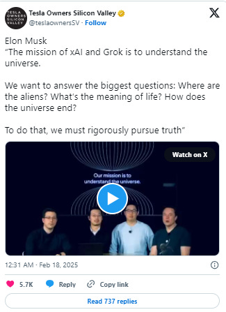 "The mission of xAI and Grok is to understand the universe. We want to answer the biggest questions: Where are the aliens? What's the meaning of life? How does the universe end? To do that, we must rigorously pursue truth."