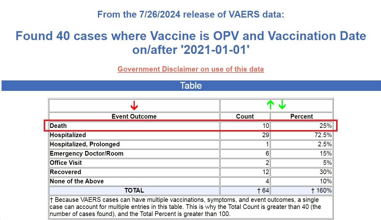 Deaths due to the new oral polio vaccine, however, which was given “emergency use authorization” (EUA), are currently about 25% of all vaccine injuries caused by the new oral polio vaccine, according to the U.S. government database of Vaccine Adverse Events Reporting System (VAERS). (Source.)