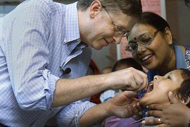 Practicing medicine without a license, Bill Gates administers an oral polio vaccine into a child in India.