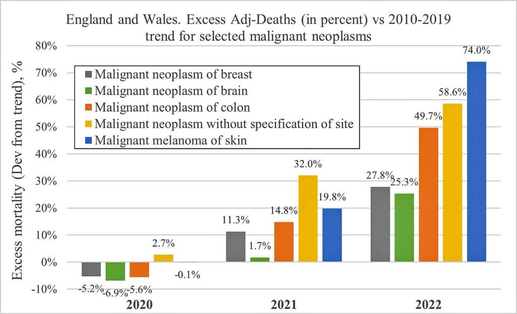 “The increase in excess deaths in 2022 is highly statistically significant (extreme event),” Dowd wrote in his report. “The results indicate that from late 2021 a novel phenomenon leading to increased malignant neoplasm deaths appears to be present in individuals aged 15 to 44 in the UK.”