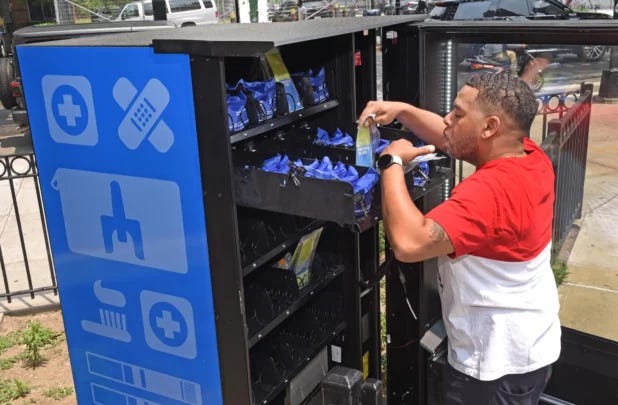 The city’s drug-user supply vending machine is so popular, workers have to refill it twice a week — with some neighbors embracing it and others saying it causes trouble like users “laid out in front of it.”