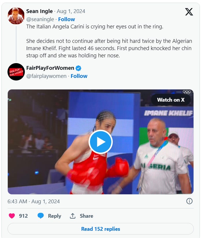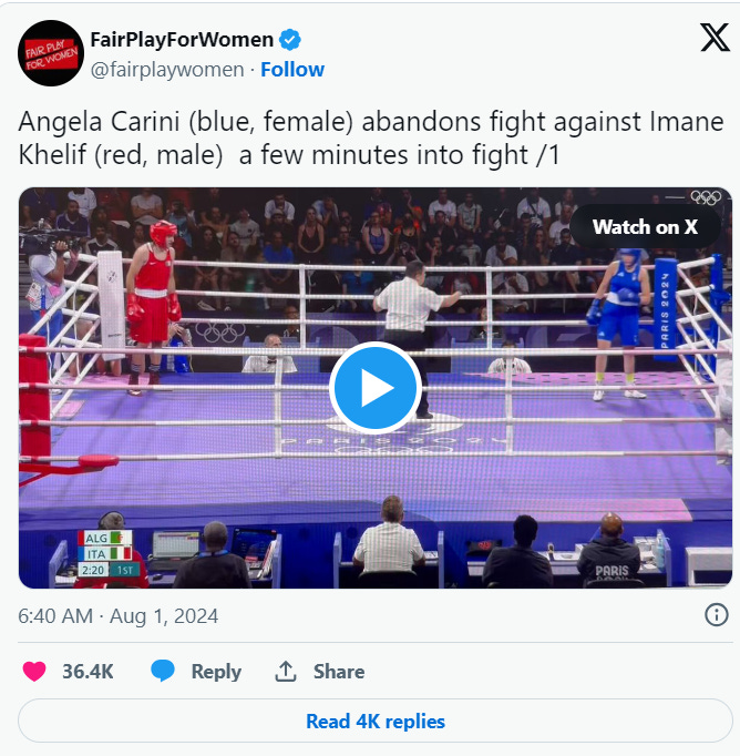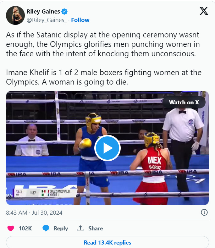 Again, watch those above clips from this morning and tell me Riley ain't on to something. It's absurd. Letting a "female" boxer who has both male and female chromosomes fight actual females, is absurd. It's looney-tunes.