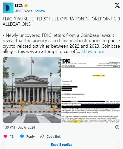 A lawsuit filed by Coinbase uncovered letters sent by the FDIC in 2022 and 2023 urging financial institutions to “pause” crypto-related activities has revealed that Operation Choke Point 2.0 is being used to sidestep constitutional limits on the government’s power to exert direct political control over the crypto sector