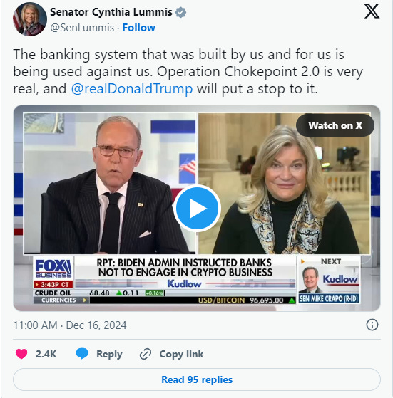 Senator Cynthia Lummis (R-WY) told Fox Business that the regulatory abuse is real and that President-elect Trump will put an end to this type of regulatory abuse