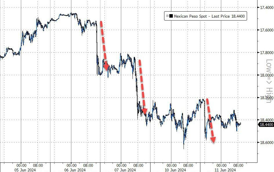 Bloomberg writes "MXN is down 1% and again among the worst performing major currencies in the word Tuesday, adding to recent losses that made it the second quarter’s biggest decliner."