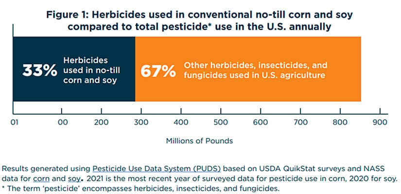Roughly one-third of total annual pesticide use in the U.S. can be attributed solely to corn and soy grown in no- and minimum-till systems, according to the FOE analysis of USDA data.