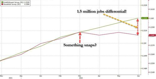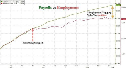 Regular readers may recall that it was back in July of 2022, when we first warned that something had "snapped" in the labor market: that's when a striking discrepancy emerged between the number of US Payrolls (as measured by the BLS' Establishment Survey, a far more crude and imprecise, yet much more market-moving data series), and the number of actual Employed Workers (as measured by the BLS' far more accurate Household Survey) . As we showed then, after the two series had tracked each other tick for tick for years, a wide gap opened in March 2022 which quickly grew to 1.5 million jobs in just 3 months...