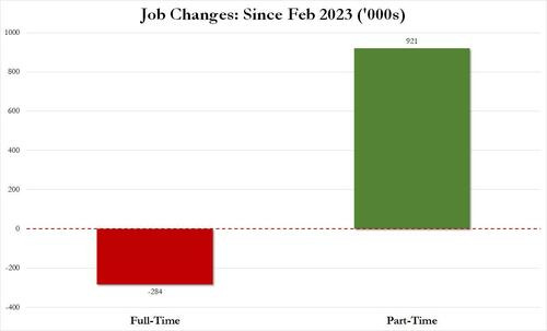 In other words, starting in 2022 and accelerating to present days, less and less full-time jobs were added, until we got to the absurd situation that all the new jobs in the past year have been part-time jobs!