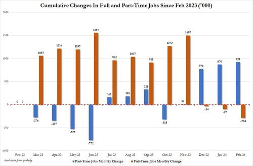 There was more: it was around the summer of 2022 that the Biden labor department - in its zeal to show job growth no matter the cost, or quality of jobs - also started fooling around with the composition of the labor market, with most of the monthly gains going to part-time workers, even as full-time workers stagnated or declined. The culmination, as we reported earlier this month, is that in February 2024, the US had 132.9 million full-time jobs and 27.9 million part-time jobs. Which is great... until you look back one year and find that in February 2023 the US had 133.2 million full-time jobs, or more than it does one year later! And yes, all the job growth since then has been in part-time jobs, which have increased by 921K since February 2023 (from 27.020 million to 27.941 million).