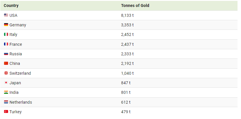 The U.S. boasts the world’s largest gold reserves, with 8,133 tonnes stored in 12 Federal Reserve Banks across the country: