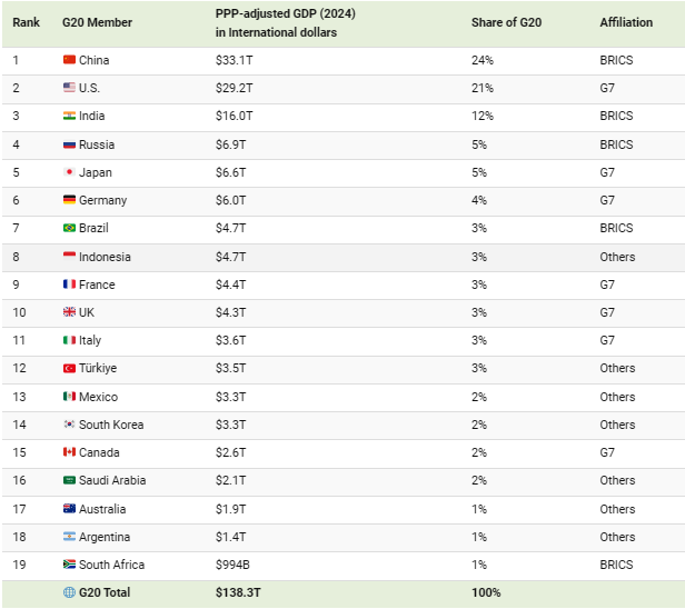 Meanwhile, here’s all G20 members ranked by their PPP-adjusted GDP in 2024.