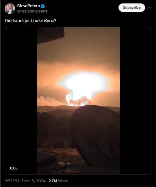 Stew Peters Tweets Speculation That Israel Nukes Syria - Discrediting Re-tweeters