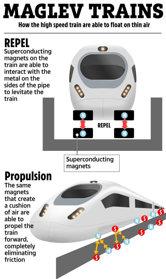 Magnetic levitation, otherwise known as maglev, use superconducting magnets in a low-vacuum pipe to strengthen the magnetic field.