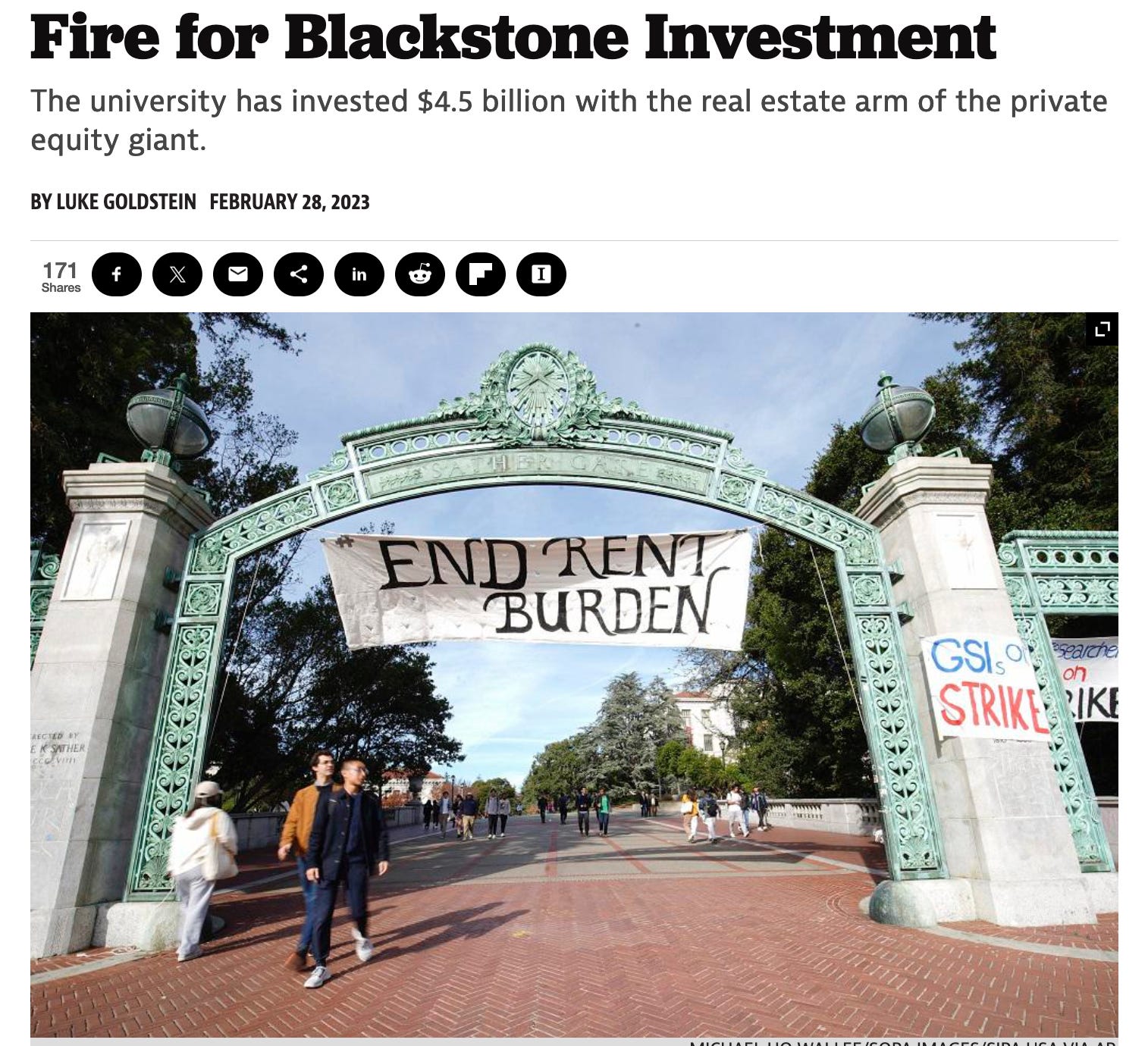 But surely our esteemed leaders in California are doing something to rein in these corporate predators, right? Right? Wrong! In a twist that would make even the most cynical among us do a spit-take, the University of California, that bastion of progressive values, decided to pour $4.5 billion into Blackstone's real estate investment trust. Yes, you read that right. The same UC system that only houses 38% of its students and where many workers struggle to make ends meet thought it would be a grand idea to cozy up to Blackstone.